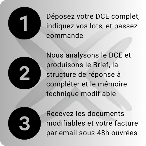 Notre service EXPRESS AO est conçu pour vous faire gagner un temps précieux. Nous livrons en quelques pages un résumé détaillé du DCE, comprenant toutes les informations clés du dossier et la structure de la réponse attendue. Ainsi, vous pouvez vous concentrer uniquement sur ce qui est essentiel sans avoir à analyser des centaines de pages.
